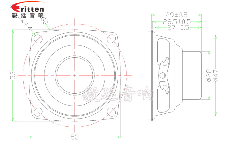 53mm方形鐵盆架內(nèi)磁全頻喇叭,鑄鐵盆架,用的是優(yōu)質(zhì)的材料一次成型,四個超大的散熱孔,散熱性能好,耐沖擊;