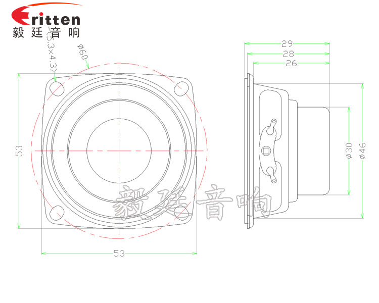 53mm方型鐵盆架內(nèi)磁喇叭,采用的是高性能稀土高強(qiáng)磁,功率大,音色飽滿(mǎn)、清晰;